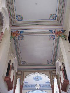 This tunic, by Catherine Ogust, was known as the "Burma" shirt (thank you, Couture Allure Vintage Fashion blog), and probably dates from about 1970. It was in impeccable condition when I found it at Savers last summer for $4.99. Here I wear it with white Trina Turk pants (eBay), a Coach scarf (consignment), a ridiculous pair of sandals that have pink pom-poms (consignment), and a vintage pink Lucite bracelet ($1, thrift store)... plus a wonderfully bright and totally ridiculous Lilly Pulitzer bag that my friend Max bought me.
